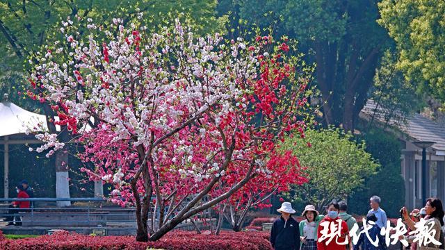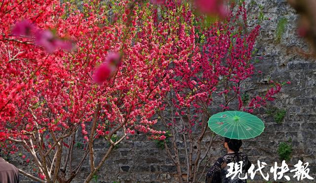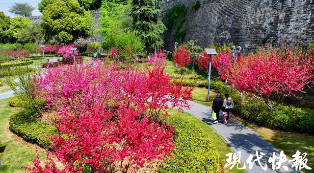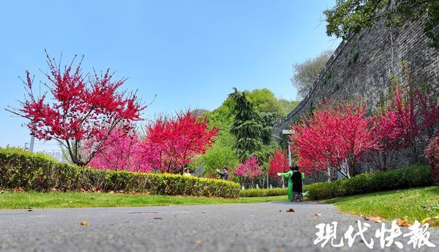 现代快报讯(记者 卢河燕/文 赵杰/摄)四月金陵,春风沉醉。碧桃、菊花桃、绯桃、垂枝桃……4月6日,现代快报记者来到南京鼓楼区护城河畔的小桃园,沿着秦淮河,20多个品种数千株桃树正竞相绽放。