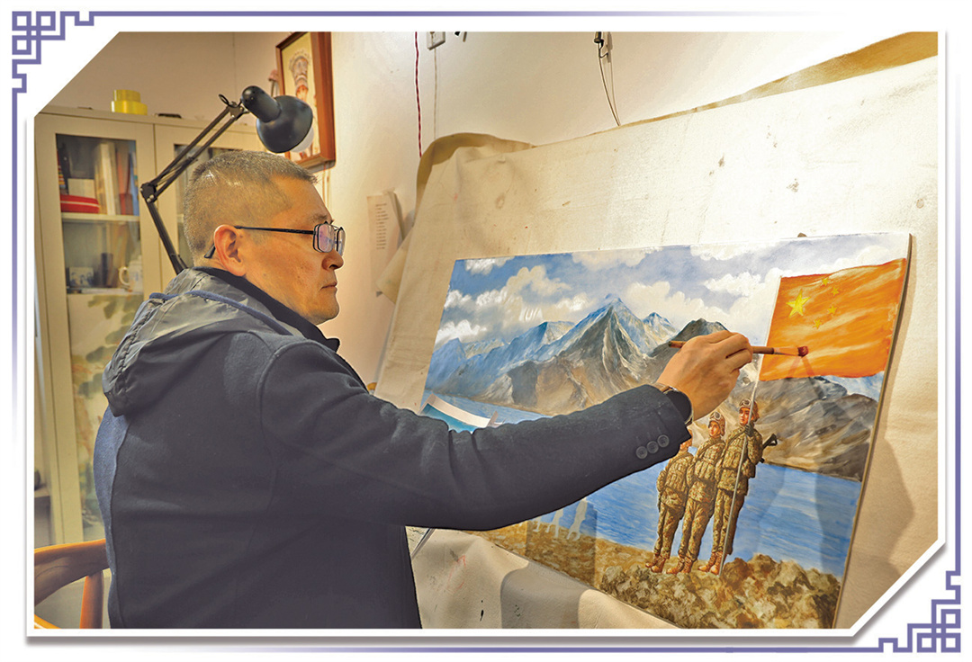 在西藏阿里军分区某边防团巡逻艇中队荣誉室里,瓷板画《情暖班公湖》是一件深受官兵喜爱的“藏品”。画面上,戍边官兵在湖边巡逻,手中高擎着五星红旗。
