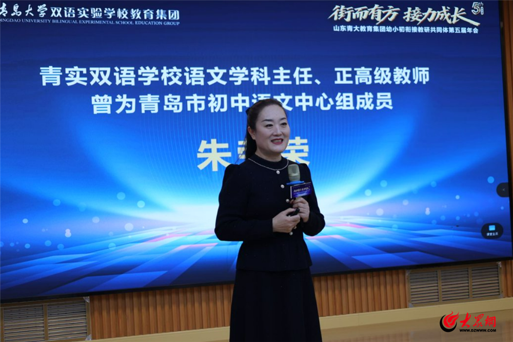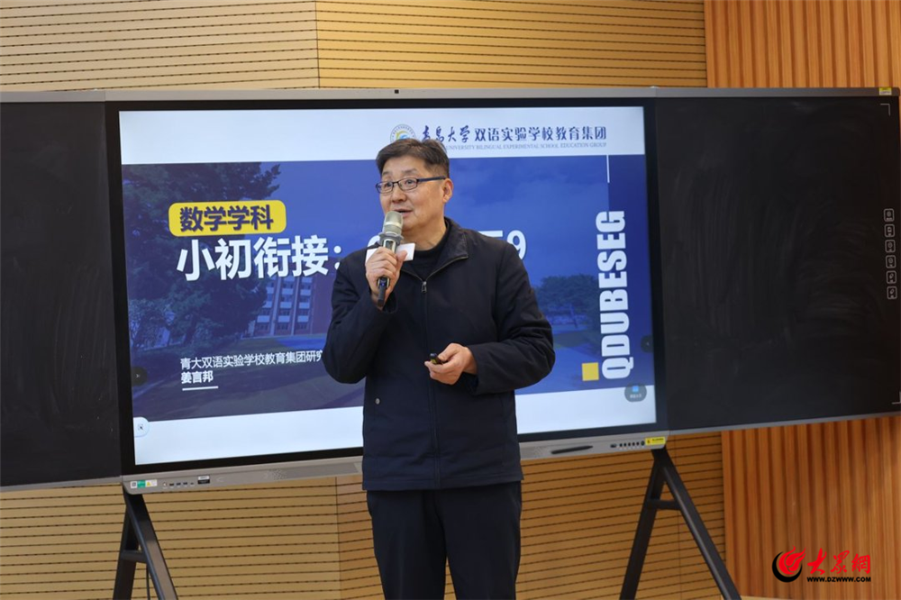 全国首位小学正高级教师、山东省教学能手同时担任青岛大学双语实验学校教育集团研究院院长助理的姜言邦教授以《数学衔接:6+39》为题,揭示了衔接的本质在于思维升级。他提出,要通过分层教学和项目式学习(PBL),引导学生从算术思维跨越到代数思维,培养解决复杂实际问题的能力。青岛大学教育科学学院副教授、硕士生导师、青岛大学教育集团副校长庞晖教授围绕小初衔接英语学习的挑战,提出“两股绳”理论,强调语言理解与单词识别需同步发展。针对学生初中阶段遇到的阅读深度不足、方法失效等问题,介绍了SEEDS课程体系及小初衔接课例,旨在帮助学生平稳过渡,实现从“学知识”到“用方法学”的转变。青实双语学校语文学科主任朱荣荣则在《了解初中,衔接无忧》中,系统梳理了从知识积累到能力建构的跃迁路径,特别针对文言文深度、阅读分析与写作立意等关键断层,提供了清晰的进阶指引。